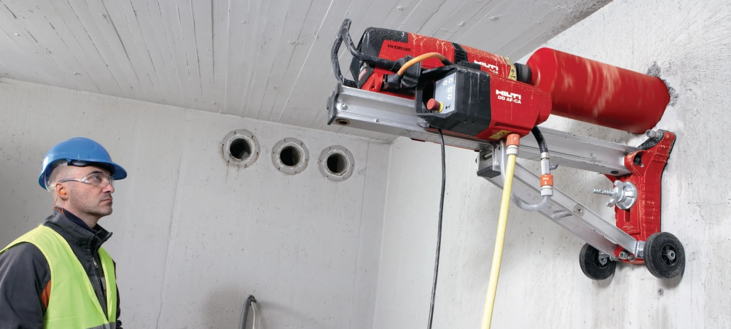 Three-phase heavy-duty diamond coring machine with high-frequency motor and optional auto-feed unit for rig-based concrete coring from 82-600 mm (3-7/32 – 23-5/8”) in diameter